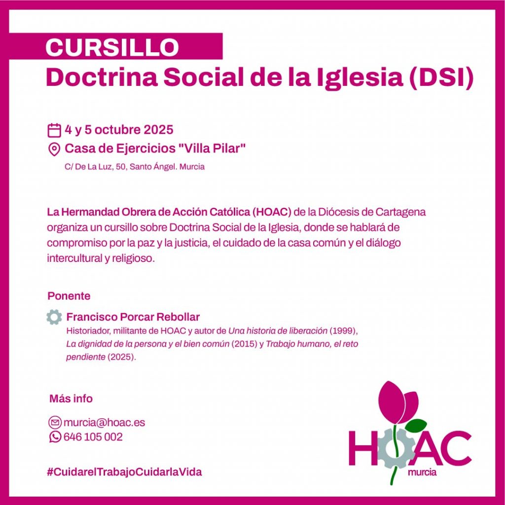Más información: https://hoacmurcia.es/2025/09/03/cursillo-sobre-doctrina-social-de-la-iglesia/